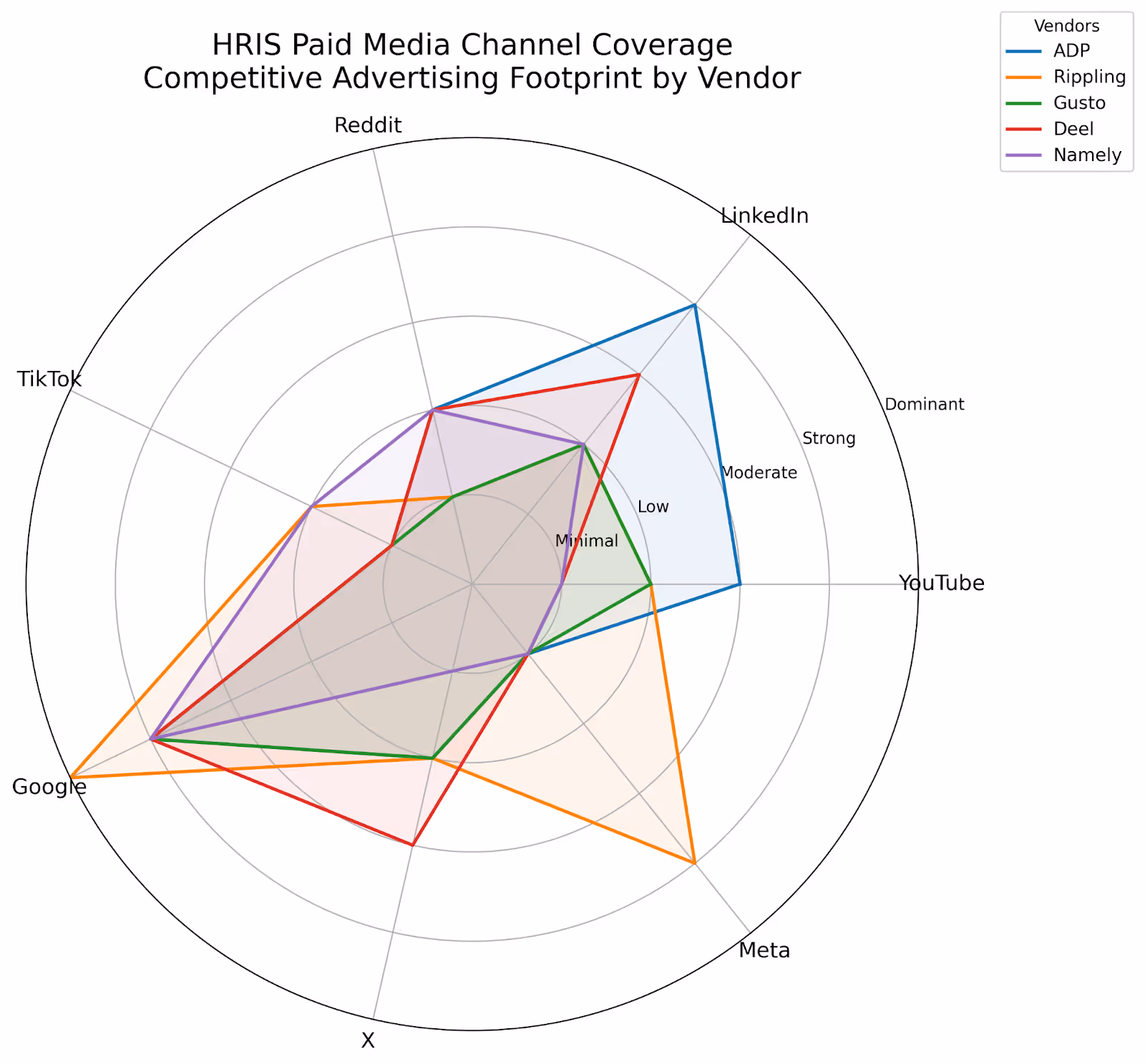 The coverage chart shows that this market is not experimenting broadly so much as clustering around the same few acquisition habits. Google is the one true constant across the set, while LinkedIn functions as the category’s default B2B amplification layer rather than a real point of differentiation. What stands out isn’t just where vendors are active, but how little separation exists outside those core channels, suggesting most players are competing in crowded, expensive environments while leaving newer or less saturated channels underdeveloped. Rippling appears to be the most willing to extend beyond the standard playbook, particularly with Meta, which makes its footprint look more intentionally diversified than the rest of the field.